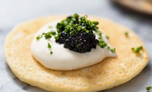 고급 블리니: 캐비어와 크림치즈를 곁들여 고급스러운 풍미를 더함.