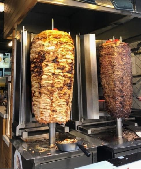 양고기, 소고기 또는 닭고기를 회전식 꼬챙이에서 구워 얇게 썰어 제공